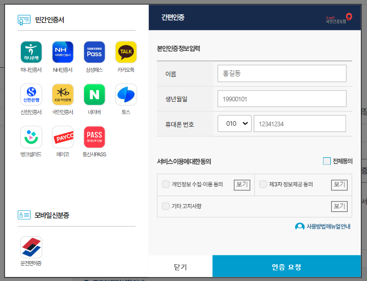 네이버 선택 후 이름, 생년월일, 휴대폰번호, 서비스이용 전체동의 후 인증요청 했습니다.