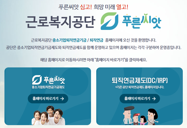 근로복지공단의 새로운 제도인 「중소기업퇴직연금기금제도 푸른씨앗」과 기존 「퇴직연금제도(DC/IRP)」 방식은 홈페이지 메인 화면에서 선택하여 볼 수 있습니다.