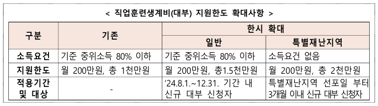 특히, 이번 집중호우 등으로 특별재난지역으로 선포된 지역에 거주하고 있는 직업훈련생은 소득요건과 무관하게 지원되고, 1인당 한도 또한 2,000만 원까지 확대됩니다.