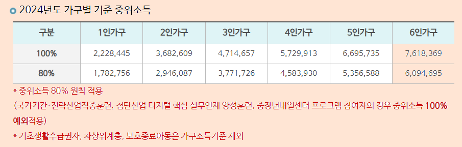 전년도 20세 이상 가구원 * 합산 월 소득이 신청년도 가구별 기준 중위소득의 80% 이하일 것